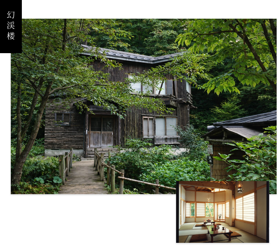露天風呂を右手に見ながら奥へ進むと、斜面に寄り添うように建つ「幻渓楼」。
