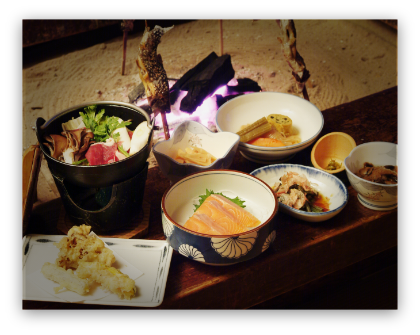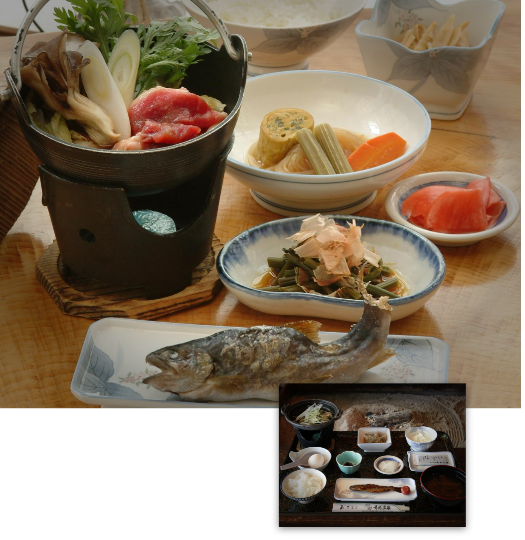 お料理はその時期にあったものを丁寧に調理してご提供します四季折々の山の恵みと川魚昔ながらの鄙びた味わいの料理を味わう幸せのひととき